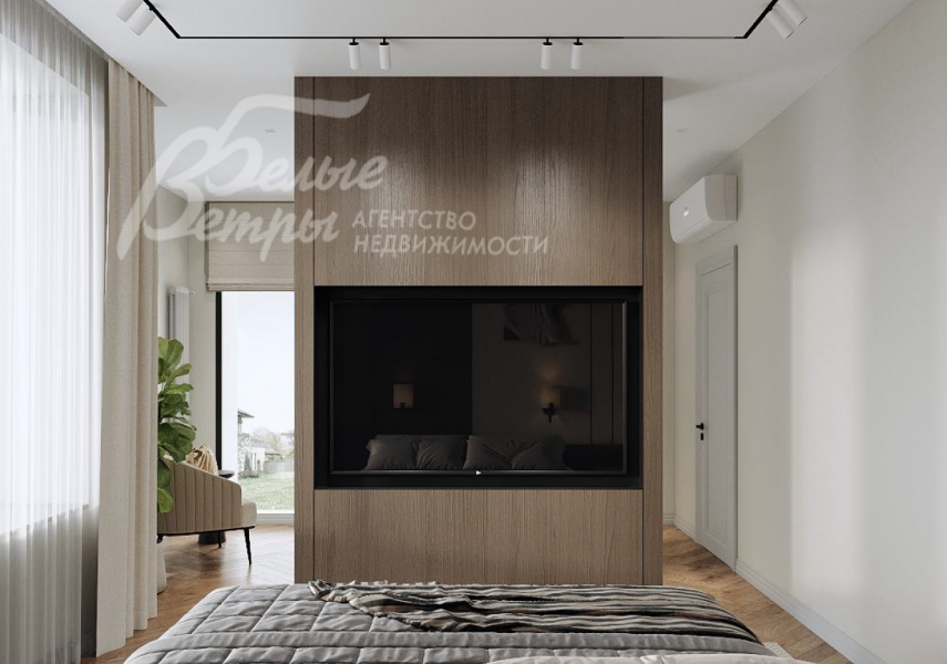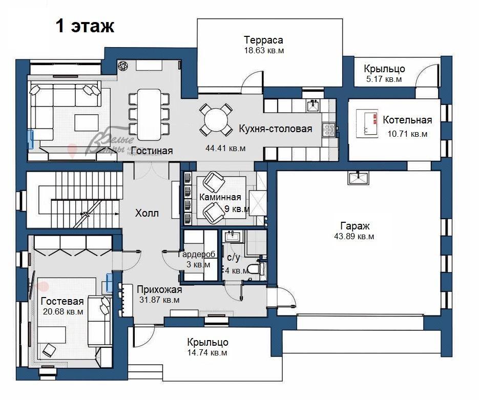 1-ый этаж: крыльцо 14.7 кв.м, прихожая-холл 32 кв.м, гардеробная 3 кв.м, полноценный гостевой санузел 4 кв.м, кабинет-спальня 20.6 кв.м. Продуманные зоны, перетекающие одна из другой: кухня-столовая-гостиная 44 кв.м с выходом на террасу 18.6 кв.м и участок, уютная каминная 9 кв.м. Теплый гараж 44 к.м, котельная 10.7 кв.м с отдельным входом.