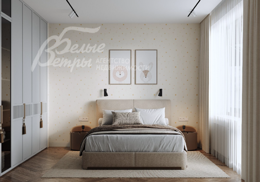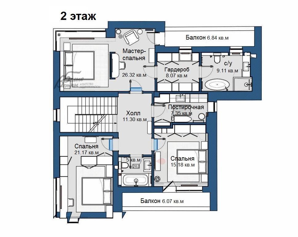 2-ой этаж: на втором этаже расположен мастер-блок общей площадью почти 50 метров: спальня 26 кв.м, ванная 9 кв.м, гардероб 8 кв.м и даже свой балкон 6 кв.м. Холл 11 кв.м, санузел 5 кв.м, детская спальня 15 кв.м с балконом 6 кв.м, гостевая спальня 21 кв.м, постирочная 7 кв.м