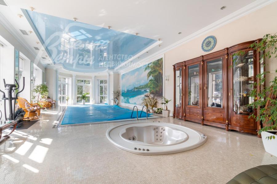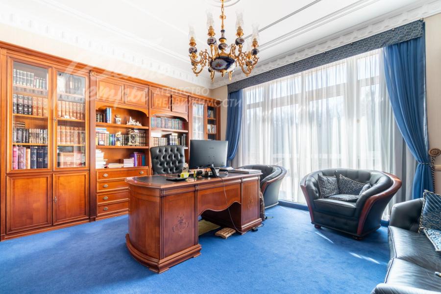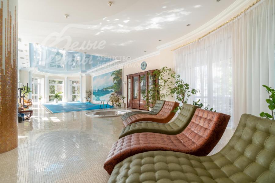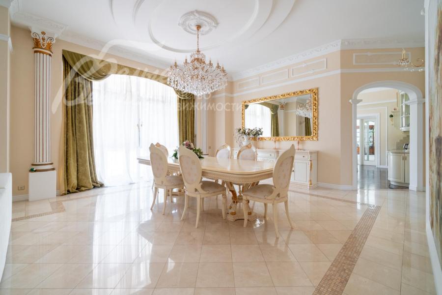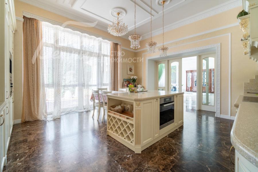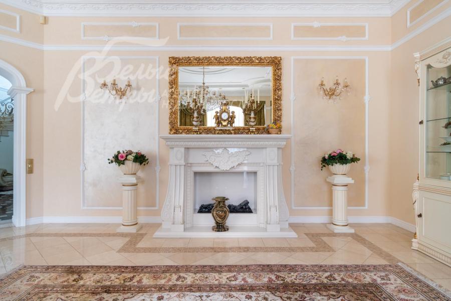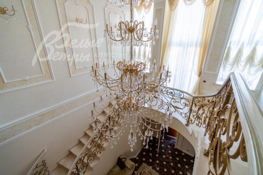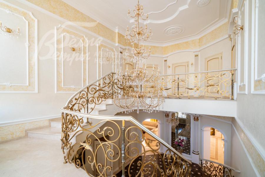 Мебель, оборудование: на кухне – гарнитур итальянского производства из массива дерева в классическом стиле с фигурными карнизами, филёнчатыми фасадами, колоннами, позолотой и столешница из искусственного камня. В гарнитур встроена техника премиум‑класса Miele: индукционная плита, вытяжка, посудомоечная машина, духовка, микроволновая печь и кофемашина. Также установлен встроенный холодильник LIEBHERR и отдельная морозильная камера LIEBHERR. В столовой размещена итальянская мебель из массива дерева в классическом стиле: большой раздвижной стол (длина от 3-4,1 м, ширина 1,3 м) на фигурных опорах, рассчитанный на 12+ персон, стулья, буфет‑комод с крупным настенным зеркалом в массивной резной раме. Интерьер дополняет хрустальная люстра с тёплой бронзовой фурнитурой. Гостиная продолжает единую стилистику обстановки: здесь расположен большой угловой диван светлого оттенка с журнальным столиком, напротив — декоративный каминный портал из белого мрамора с изящной лепниной, резным центральным картушем и фигурными боковыми колоннами. Над камином — крупное зеркало в золочёной раме. В гостиной — изящные настенные бра, витринные шкафы и дорогостоящая хрустальная люстра, телевизор LG. Гостиную и столовую дополняют плотные портьеры благородного оливково‑золотистого оттенка. Над лестничным холлом висит 5-тиярусная итальянская хрустальная люстра высотой 4м на 52 лампы. В кабинете на втором этаже размещена солидная итальянская мебель из массива дерева: большой письменный стол, шкафы‑витрины, стеллажи и кожаный диван с двумя креслами. Интерьер дополняет крупная люстра в классическом стиле с фарфоровыми вставками с цветочным рисунком и позолоченными элементами. Все спальни полностью меблированы дорогой итальянской классической мебелью в разных цветовых решениях, объединенными единой стилистикой: кроватями, прикроватными тумбами, шкафами, комодами из массива дерева. В каждой спальне также есть диваны, настенные бра, хрустальные люстры и люстры с абажурами. В санузлах — сантехника Geberit, Villeroy&Boch, смесители Hansgrohe: установлены раковины, душевые кабины, ванная, унитазы, биде, гигиенические души. В постирочной — стиральная машина Miele. В SPA-зоне: переливной бассейн 8×4 м глубиной до 1,85 м с водопадом, подводным массажем и противотоком и большая встроенная джакузи (США), углубленная в пол. В парной зоне — электрическая и инфракрасная сауны, хамам, купель глубиной более 2 м, отделанная мраморной мозаикой, тропический душ. На цокольном этаже — соляная комната с тремя шезлонгами: установлен галогенератор для создания солевого аэрозоля