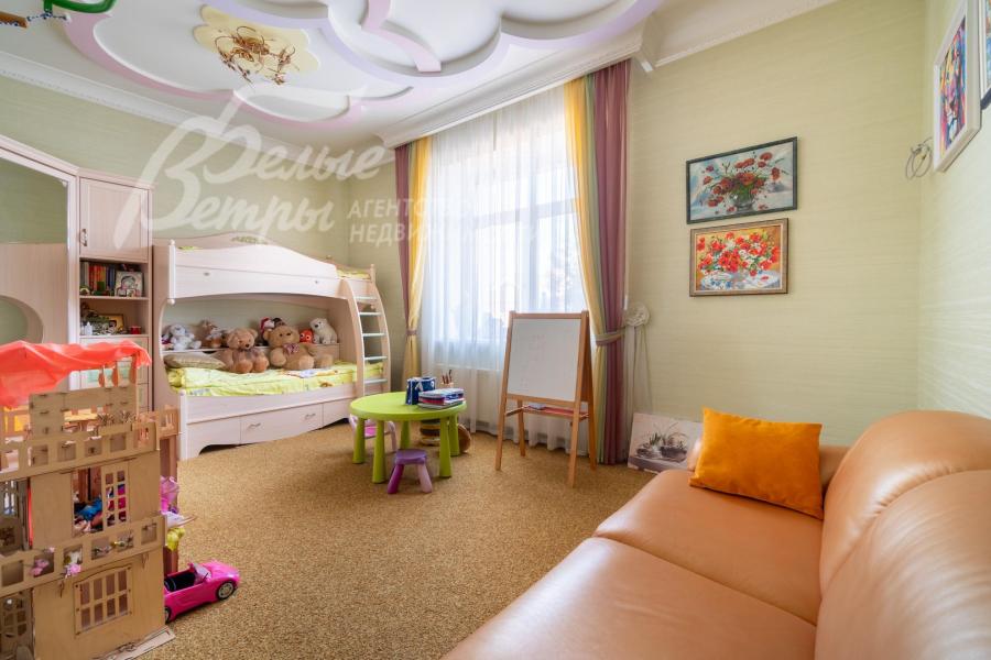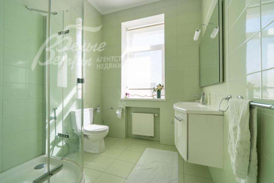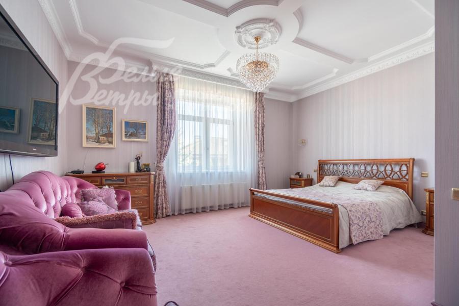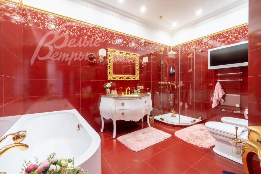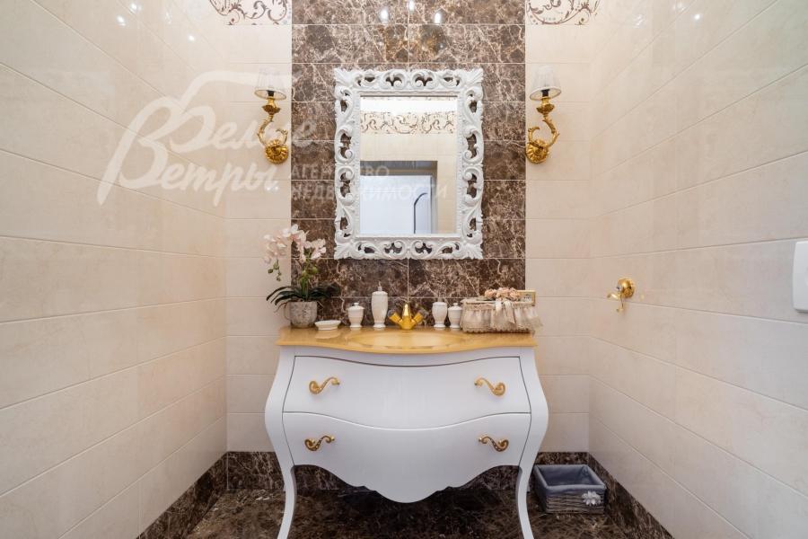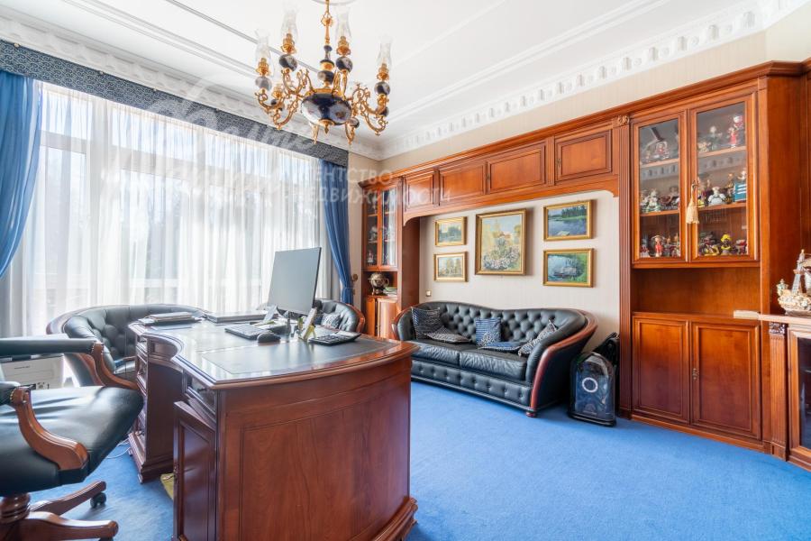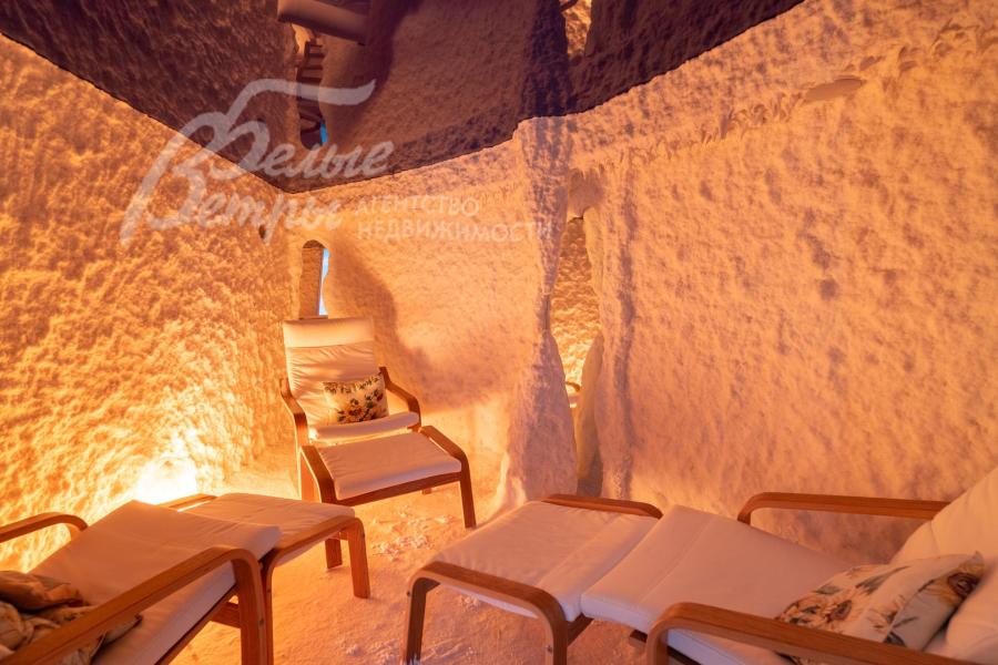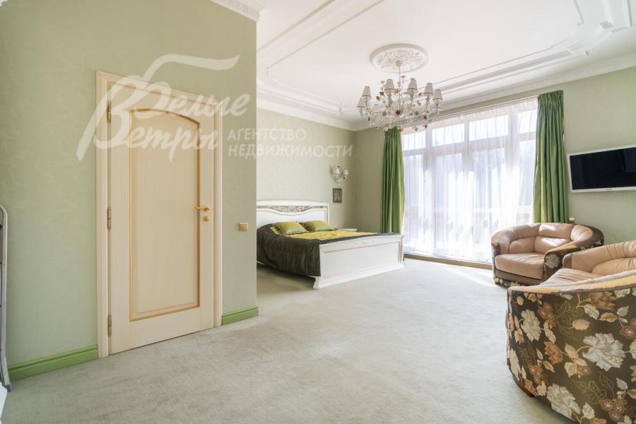 Мебель, оборудование: на кухне – гарнитур итальянского производства из массива дерева в классическом стиле с фигурными карнизами, филёнчатыми фасадами, колоннами, позолотой и столешница из искусственного камня. В гарнитур встроена техника премиум‑класса Miele: индукционная плита, вытяжка, посудомоечная машина, духовка, микроволновая печь и кофемашина. Также установлен встроенный холодильник LIEBHERR и отдельная морозильная камера LIEBHERR. В столовой размещена итальянская мебель из массива дерева в классическом стиле: большой раздвижной стол (длина от 3-4,1 м, ширина 1,3 м) на фигурных опорах, рассчитанный на 12+ персон, стулья, буфет‑комод с крупным настенным зеркалом в массивной резной раме. Интерьер дополняет хрустальная люстра с тёплой бронзовой фурнитурой. Гостиная продолжает единую стилистику обстановки: здесь расположен большой угловой диван светлого оттенка с журнальным столиком, напротив — декоративный каминный портал из белого мрамора с изящной лепниной, резным центральным картушем и фигурными боковыми колоннами. Над камином — крупное зеркало в золочёной раме. В гостиной — изящные настенные бра, витринные шкафы и дорогостоящая хрустальная люстра, телевизор LG. Гостиную и столовую дополняют плотные портьеры благородного оливково‑золотистого оттенка. Над лестничным холлом висит 5-тиярусная итальянская хрустальная люстра высотой 4м на 52 лампы. В кабинете на втором этаже размещена солидная итальянская мебель из массива дерева: большой письменный стол, шкафы‑витрины, стеллажи и кожаный диван с двумя креслами. Интерьер дополняет крупная люстра в классическом стиле с фарфоровыми вставками с цветочным рисунком и позолоченными элементами. Все спальни полностью меблированы дорогой итальянской классической мебелью в разных цветовых решениях, объединенными единой стилистикой: кроватями, прикроватными тумбами, шкафами, комодами из массива дерева. В каждой спальне также есть диваны, настенные бра, хрустальные люстры и люстры с абажурами. В санузлах — сантехника Geberit, Villeroy&Boch, смесители Hansgrohe: установлены раковины, душевые кабины, ванная, унитазы, биде, гигиенические души. В постирочной — стиральная машина Miele. В SPA-зоне: переливной бассейн 8×4 м глубиной до 1,85 м с водопадом, подводным массажем и противотоком и большая встроенная джакузи (США), углубленная в пол. В парной зоне — электрическая и инфракрасная сауны, хамам, купель глубиной более 2 м, отделанная мраморной мозаикой, тропический душ. На цокольном этаже — соляная комната с тремя шезлонгами: установлен галогенератор для создания солевого аэрозоля