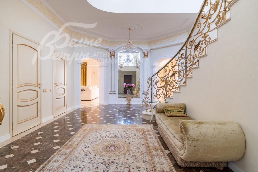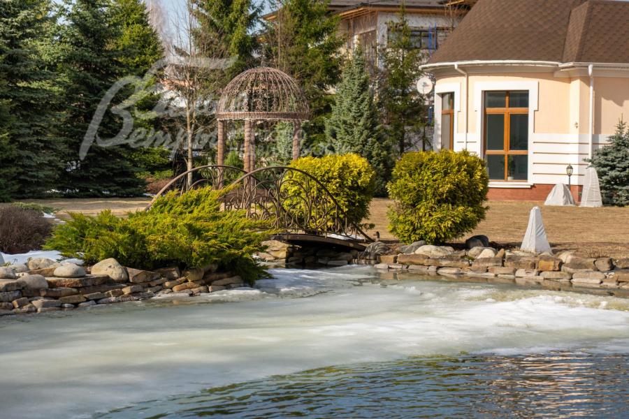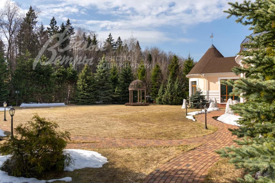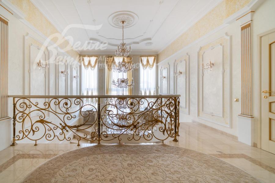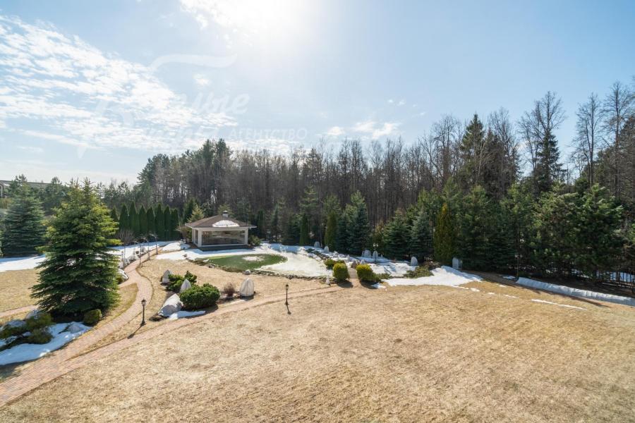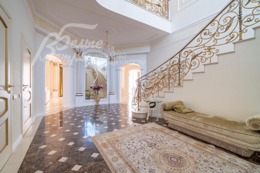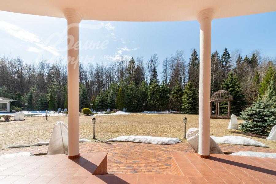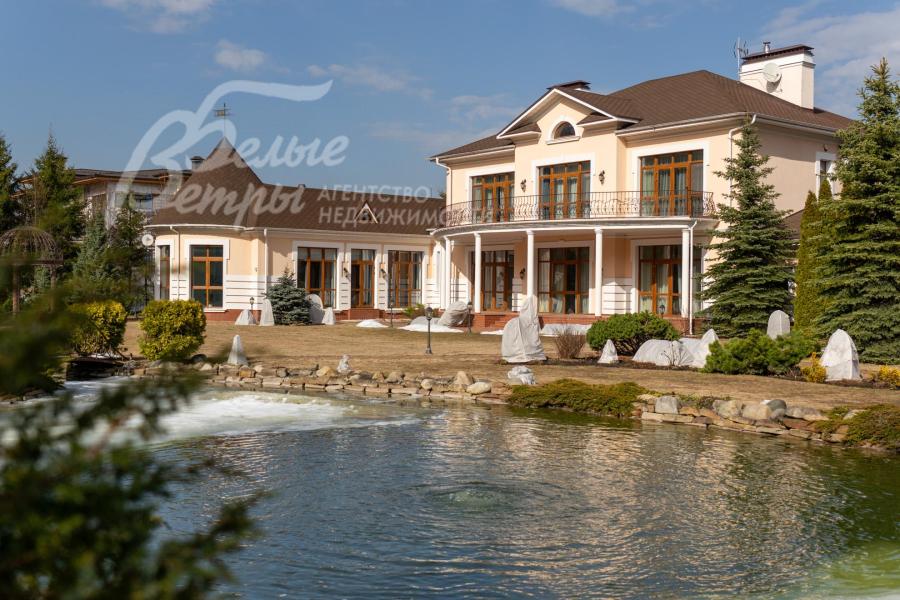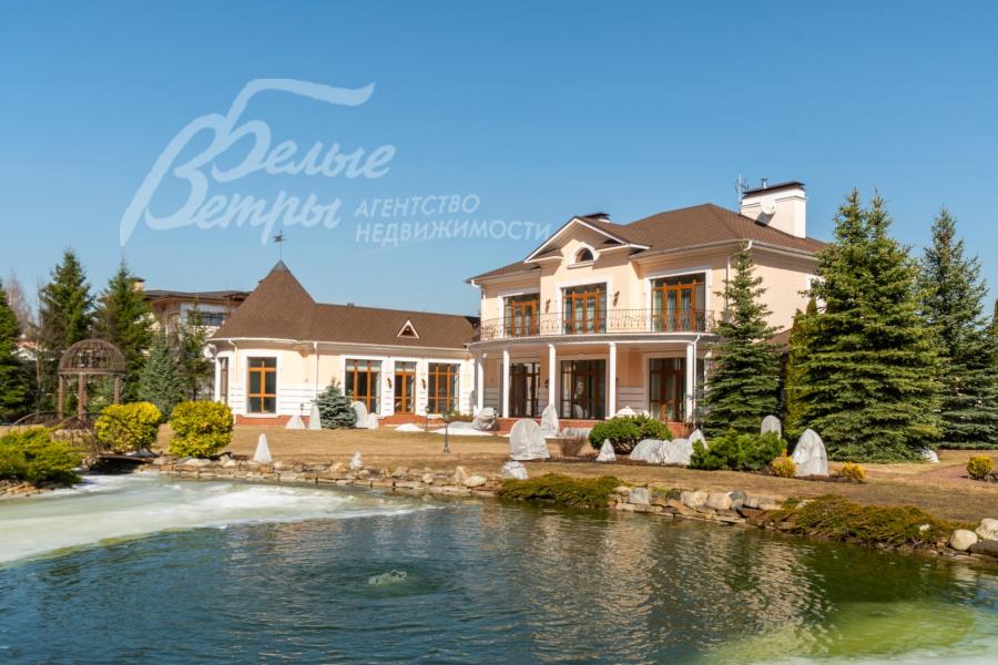 Кирпичный меблированный дом‑усадьба с выразительными чертами классической архитектуры, впечатляющий внутренней отделкой, огромным участком с парковым ландшафтом, собственным прудом и прилесной территорией. В доме — просторная спа-зона с большим бассейном, джакузи, купелью, парной, инфракрасной сауной, хамамом, есть соляная комната. В планировке – более 125 м² террас и балконов. В отделке – несколько видов мрамора, фрески, лепнина, молдинги, пилястры. Интерьер дополнен итальянской мебелью. На участке построены отдельный дом для персонала и застеклённая беседка, стоящая на пруду. Ландшафт украшают мостик, ротонда, зоны для прогулок. На территории высажены туи, сосны, ели, цветники, сады. Участок находится в строго охраняемом коттеджном посёлке с центральными коммуникациями рядом с платной дорогой.