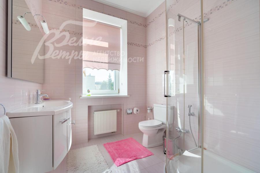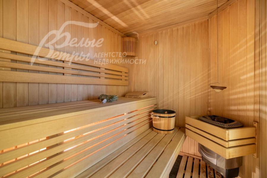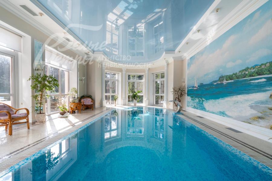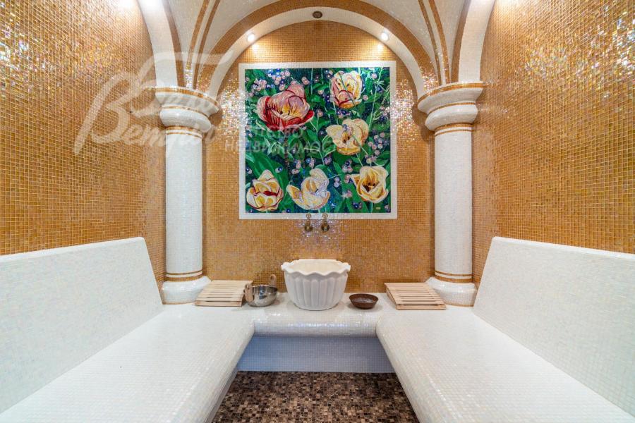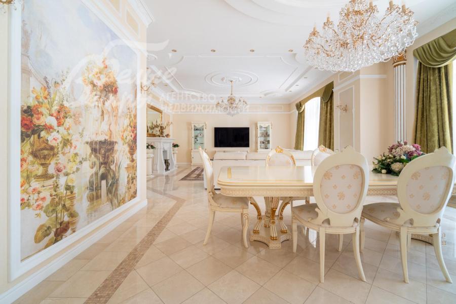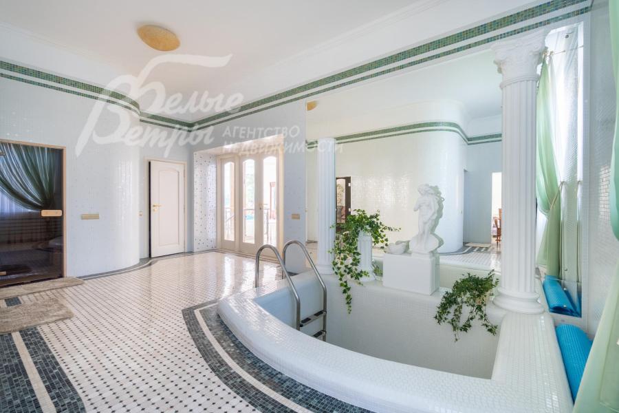 Описание внутренней отделки: выполнена отделка в классическом стиле с использованием дорогих натуральных материалов. Стены в основном доме отделаны венецианской штукатуркой в светлых тонах со множеством декоративных элементов — филёнок, молдингов, багетов, колонн и пилястр. В столовой акцентные фрески с цветочно‑садовым сюжетом. Гостиная украшена роскошным каминным порталом из белого мрамора с изящной лепниной и резным центральным картушем. В зоне бассейна — фреска с морским пейзажем, колонна, облицованная мелкоформатной стеклянной мозаикой с градиентным рисунком, мозаичное панно. В СПА‑зоне стены оформлены мраморной мозаикой, а в санузле при СПА — мрамором Имперадор Дарк с полосами из светлой мозаики. На втором этаже в спальнях и кабинете поклеены качественные обои, в санузлах — плитка. На полу первого этажа в холле — мраморная плитка Имперадор Дарк с бежевыми квадратными вставками из мрамора Крема Марфил. В гостиной и на кухне уложена светлая мраморная плитка с мозаичными вставками по периметру, на кухне также присутствует мрамор Имперадор Дарк. В зона бассейна выполнена сложная мозаичная отделка пола из мрамора. Контур чаши бассейна подчеркнут бордюром из мозаики более тёмного тона, а лестница в цоколь по краям обрамлена тёмной мозаикой и плиткой Имперадор Дарк. На втором этаже в спальнях — ковролин, в санузлах — плитка. Потолки выполнены из гипсокартона и имеют многоуровневую конструкцию, дополненную декором: розетками, молдингами, широкими карнизами и лепниной. Межкомнатные двери в классическом стиле выполнены из массива дерева светлого цвета, украшены филёнками и золочёным багетом по контуру, оснащены итальянской фурнитурой из латуни. По всему дому установлены мраморные подоконники. На второй этаж ведёт элегантная изогнутая железобетонная лестница с эффектной межэтажной площадкой шириной 5 м: ступени — мраморные, ограждение — изящная художественная ковка с золотой патиной, дополненная деревянными поручнями, плавно повторяющими изгиб лестничного марша. Сауна отделана абашем, в ней установлена печь Harvia. Великолепная отделка хамама из мозаики.