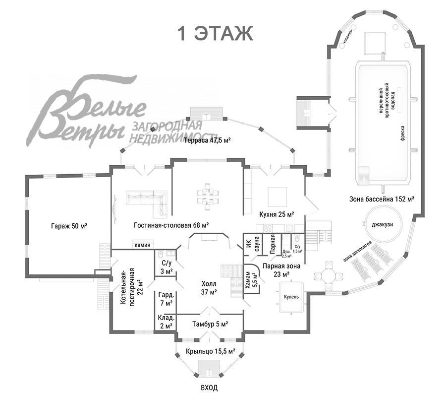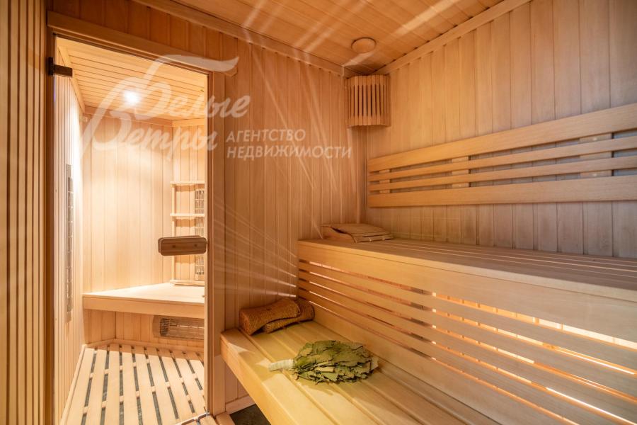 спа-зона: зона бассейна 152 кв.м с бассейном (чаша 8×4 м), джакузи, зоной шезлонгов, столовой и с выходом на участок, парная зона 23 кв.м с парной и инфракрасной сауной 7,5 кв.м, хамамом 5,5 кв.м, душевой 2,5 кв.м, санузлом 1,5 кв.м