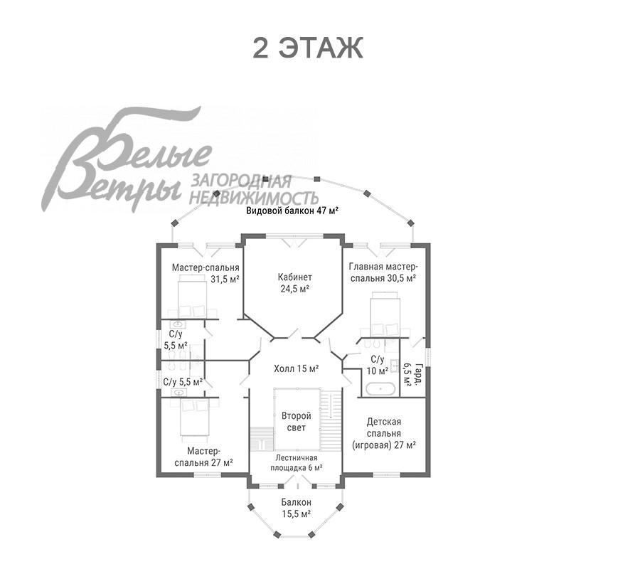 2-ой этаж: холл 15 кв.м, лестничная площадка 6 кв.м с выходом на балкон 15,5 кв.м, главная мастер-спальня 30,5 кв.м с гардеробной 6,5 кв.м, санузлом 10 кв.м и выходом на видовой балкон 47 кв.м, мастер-спальня 31,5 кв.м с санузлом 5,5 кв.м с выходом на видовой балкон, мастер-спальня 27 кв.м с санузлом 5,5 кв.м, детская спальня (игровая) 23,5 кв.м, кабинет 24,5 кв.м с выходом на видовой балкон